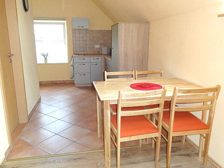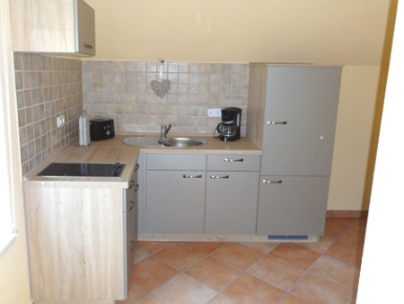 - Küche mit Esstisch und Einbauküche( Kühlschrank mit Gefrierteil, zwei Kochplatten, Mini-Elektroherd, Kaffeemaschine, Toaster, Wasserkocher sowie weitere Küchenutensilien und Geschirr)